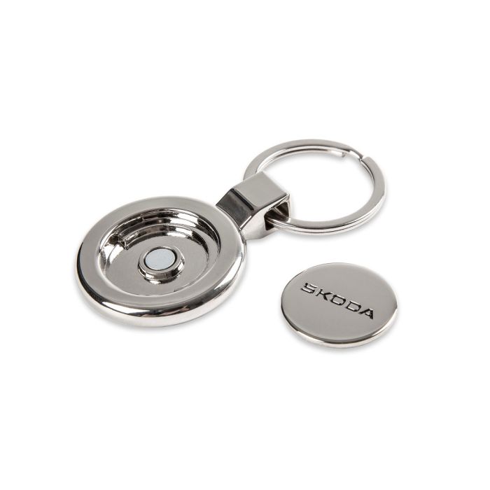 chlüsselanhänger aus Metall mit geprägter Aufschrift Let's Explore auf der Vorderseite und abnehmbarem magnetischen Metallchip mit geprägtem Škoda-Logo auf der Rückseite.
